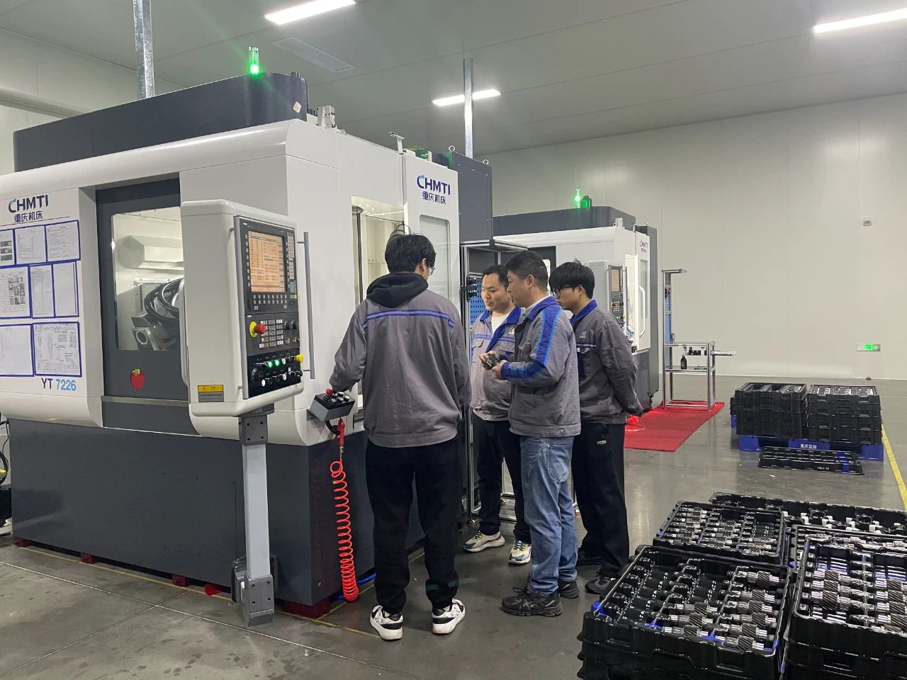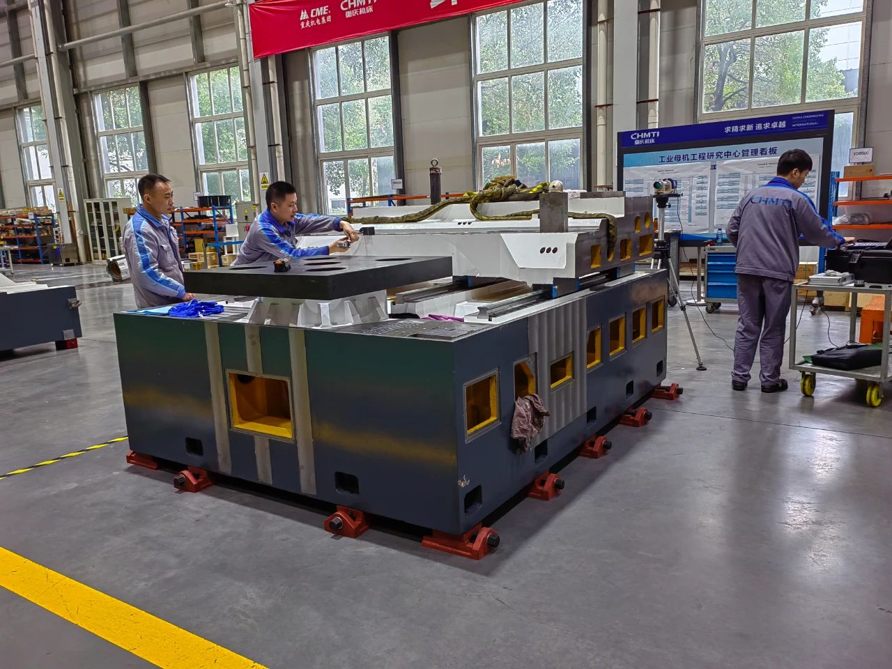为确保参展机床按时完工,技术团队与装配技师紧密配合,从零部件的组装到机床的大件定位,每一道工序都严格把关,精益求精,紧密协作,展现出高度的责任感和团队凝聚力。